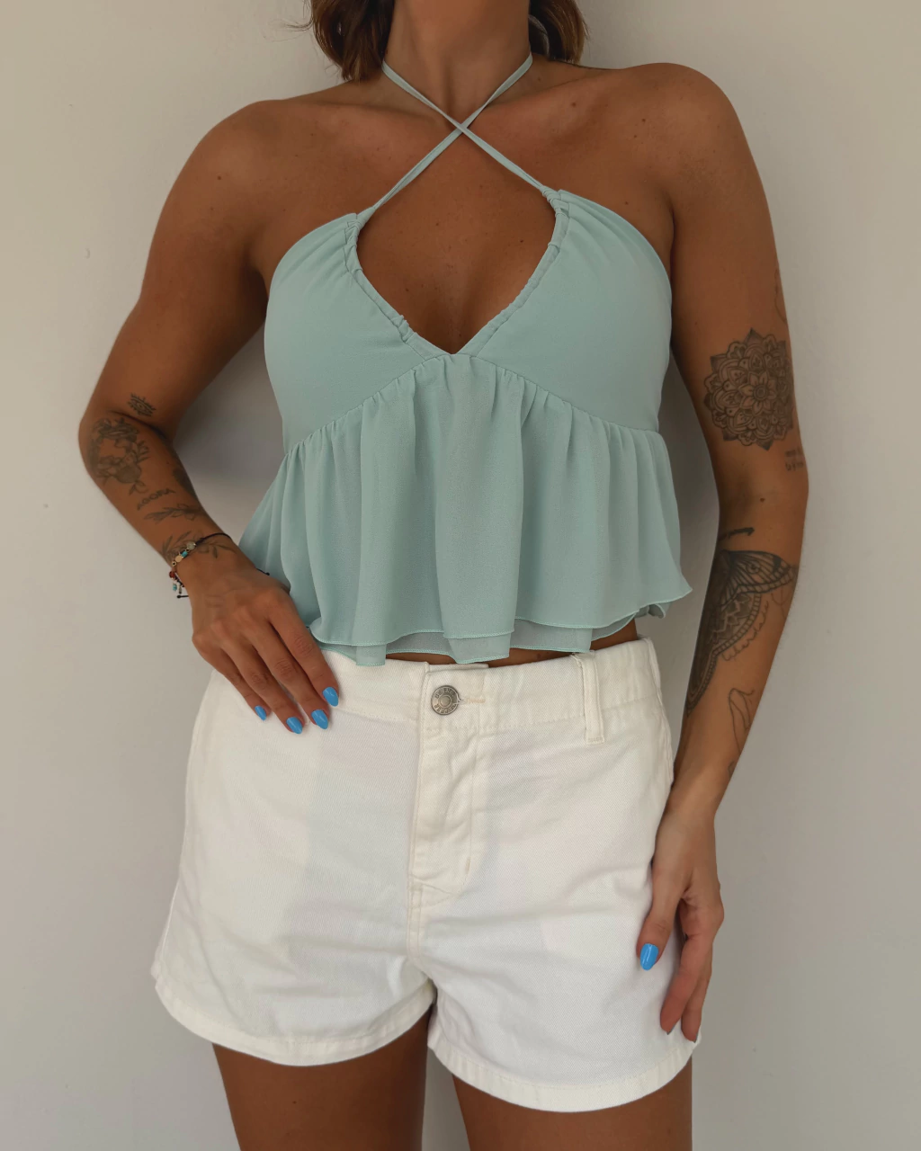 Observações: Contém forro, pode ser usada com decote V ou com amarração no busto. Contém lastex nas costas.