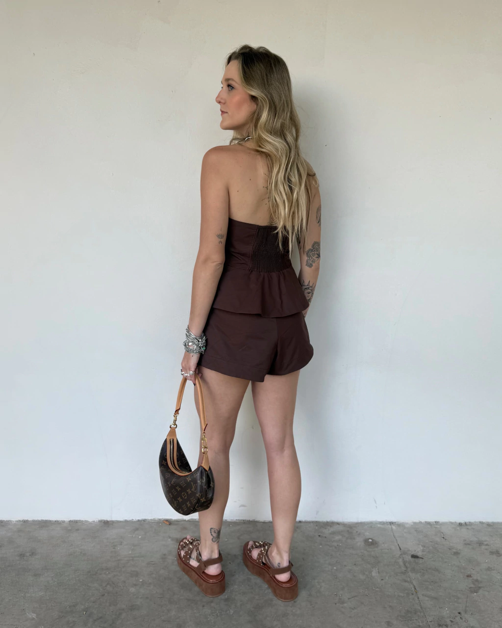 Observações: Possui lastéx atrás e fechamento na frente com botões. Moelagem peplum.