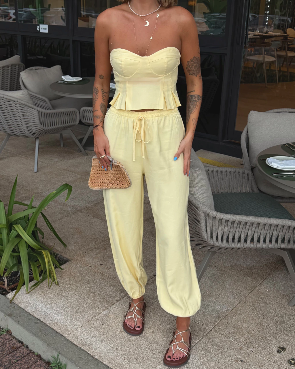 Observações: Blusa com tecido duplo e lastex nas costas. Calça com elastico na cintura e na barra.