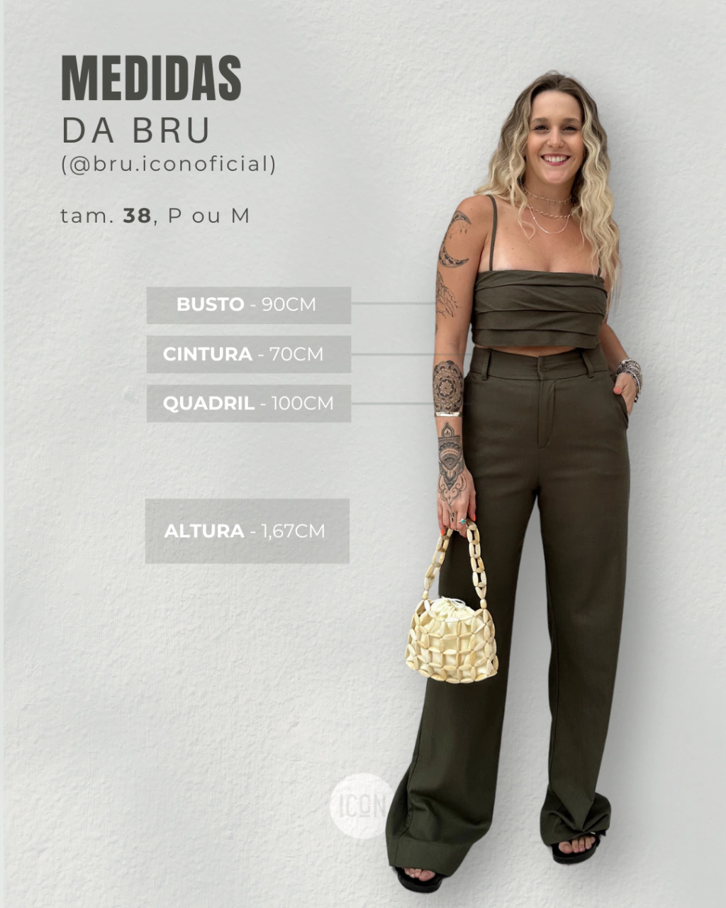 REFERÊNCIA: Modelo Bruna usa tamanho 38 e está vestindo tamanho 38.