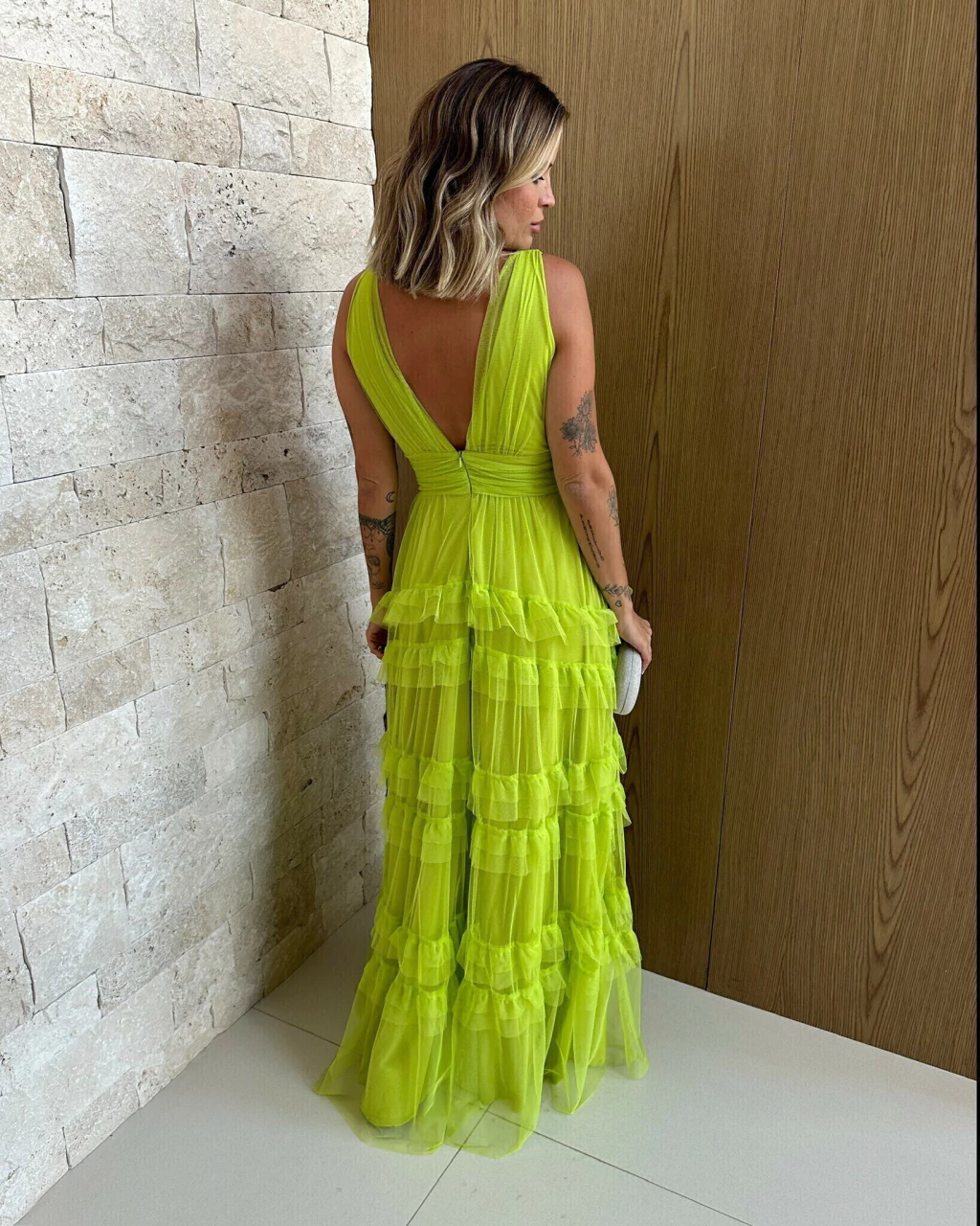 - vestido modelo longo todo em tule, com detalhes em camadas, decote em v no busto e nas costas, com alça um pouco mais grossa (possui bojo)